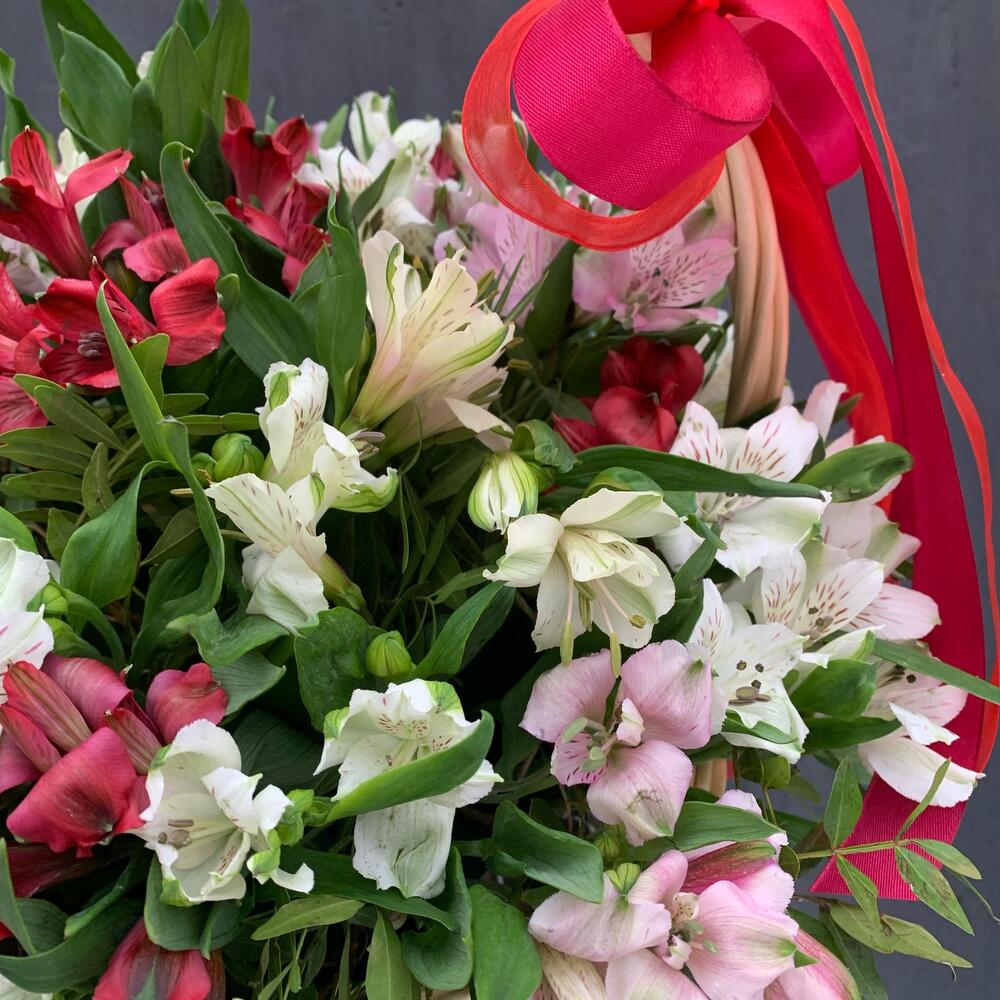 Альстромерия – 17 шт.Зелень – 10 шт.Оазис – 1 шт.Корзина плетеная – 1 шт.