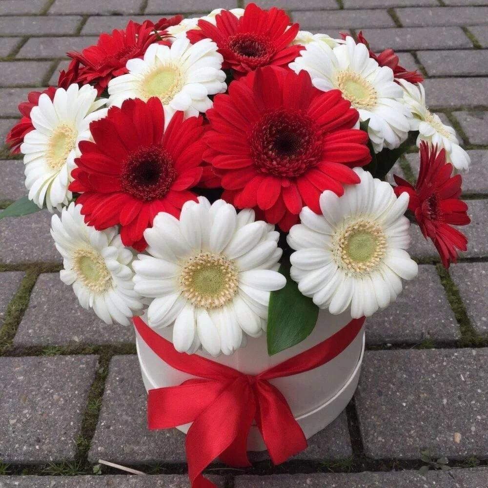 Букет из 17 красных и белых гербер в дизайнерской коробке “Рокси”