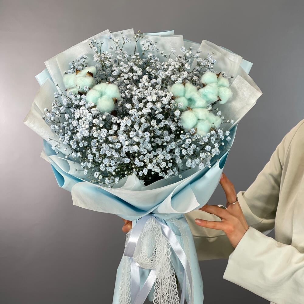 Букет из голубой гипсофилы с хлопком Воздушное облачко