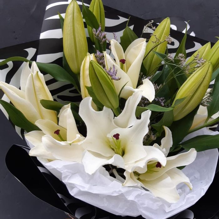 Лилия белая – 5 шт.лимониум или гипсофила или статица – 2 шт.Упаковка дизайнерская – 2 шт.Лента атласная – 1 шт.