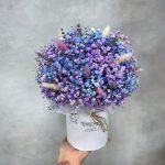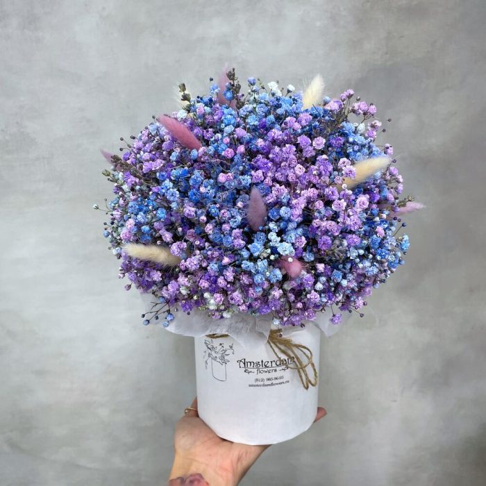 Коробка шляпная – 1 шт. Лагурус – 15 шт. Оазис флористический – 1 шт. гипсофила цветная – 7 шт.