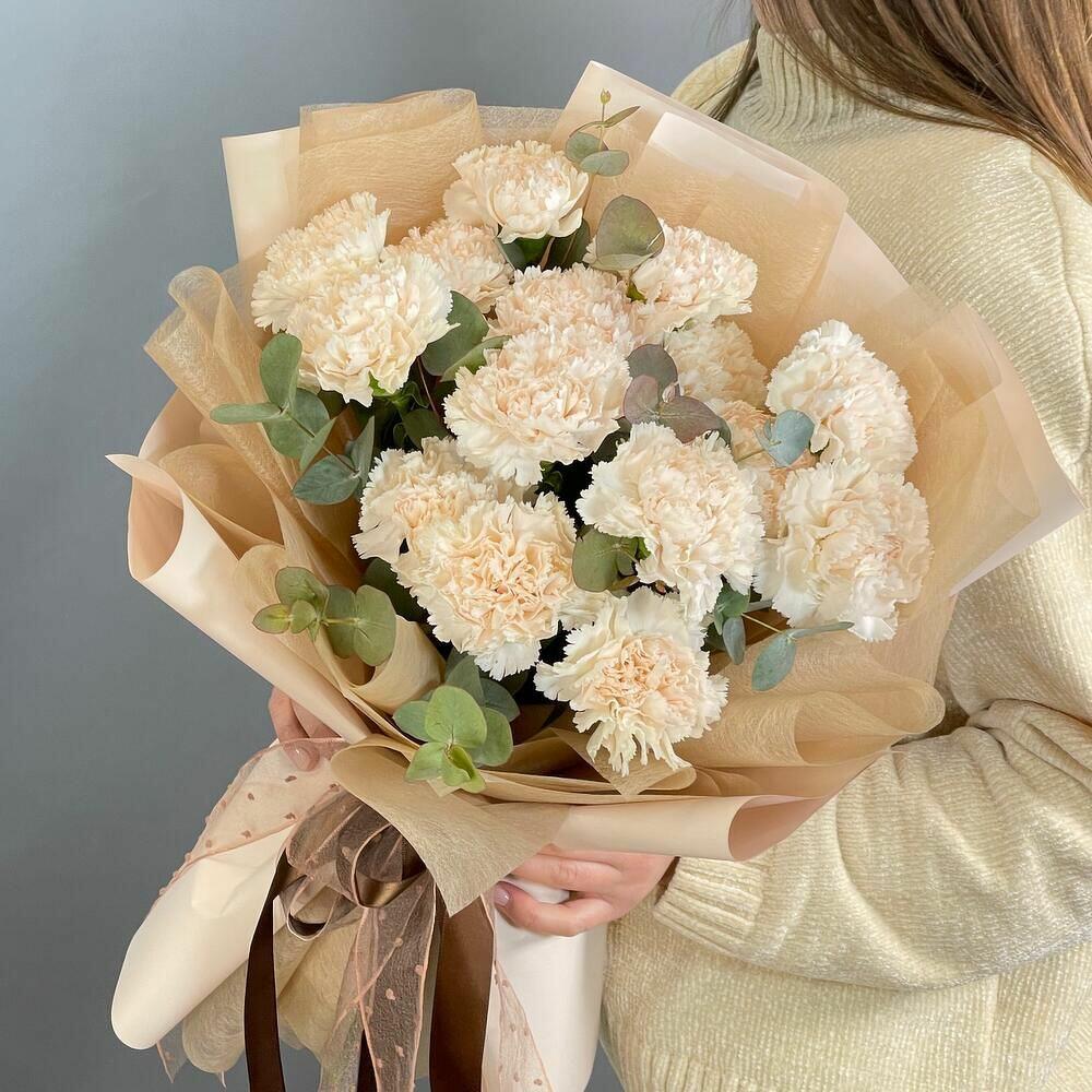 Лента – 2 шт.Эвкалипт – 2 шт.Гвоздика сортовая – 15 шт.Упаковка дизайнерская – 2 шт.