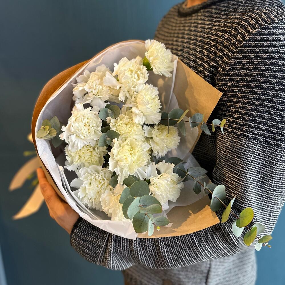 Диантус – 13 шт.Эвкалипт – 1 шт.Крафт упаковка – 1 шт.Тишью – 1 шт.Лента атласная – 1 шт.