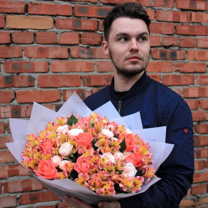 Альстромерия – 20 шт.Рускус – 7 шт.Лента атласная – 1 шт.Роза кустовая пионовидная – 5 шт.упаковочный материал – 3 шт.роза жиардина – 10 шт.