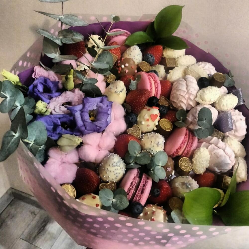Клубника – 13 шт.Голубика – 10 шт.Лизиантус сиреневый – 4 шт.Хлопок натуральный – 7 шт.Лизиантус алиса пинк – 3 шт.макарон (пирожное) – 4 шт.Зефир клубничный – 6 шт.Клубника в шоколаде callebaut (бельгия) – 14 шт.зелень декоративная – 4 шт.конфеты кокосовые – 12 шт.транспортировочная упаковка – 1 шт.Упаковка дизайнерская – 1 шт.конфеты золотые – 16 шт.
