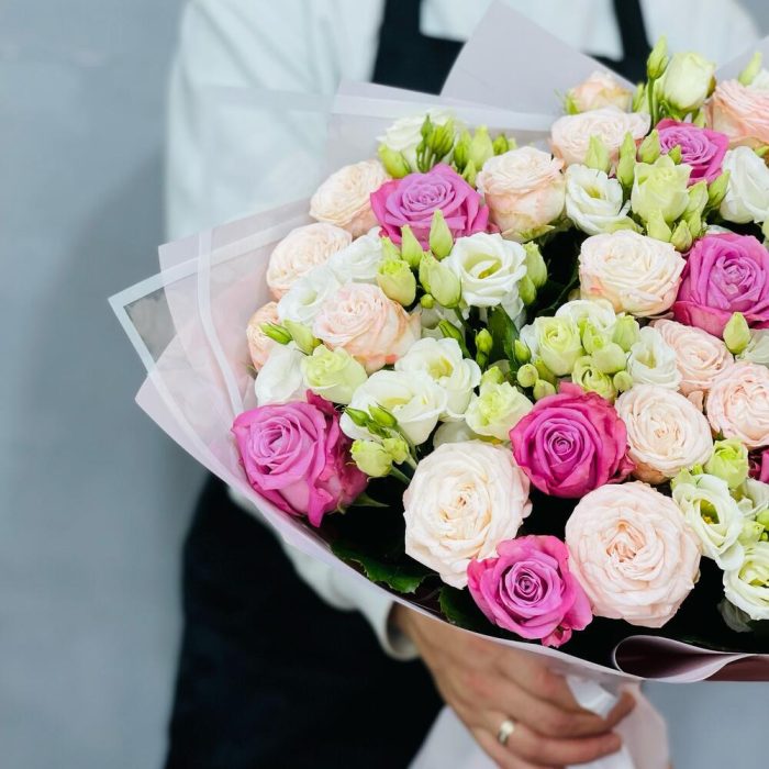 Букет в таком сочетании нежности и легкости подарит только самые искренние и положительные эмоции. А стильная упаковка отлично дополняет его.Уход :1. После доставки букета обязательно подрежьте стебли на 1-2 см под косым углом.2. Налейте воду в вазу минимум 2/3 от высоты букета . 3. Меняйте воду , мойте вазу и подрезайте стебли каждый день. 4. Храните Цветы подальше от солнечных лучей, тепло-обогревателей, фруктов и сквозняков. 5. Если букет был доставлен в минусовую температуру, дайте цветам полежать 15-20 минут для того , чтобы они могли принять комнатную температуру. Затем подрежьте стебли и поставьте в вазу.