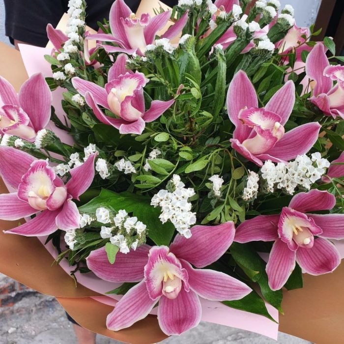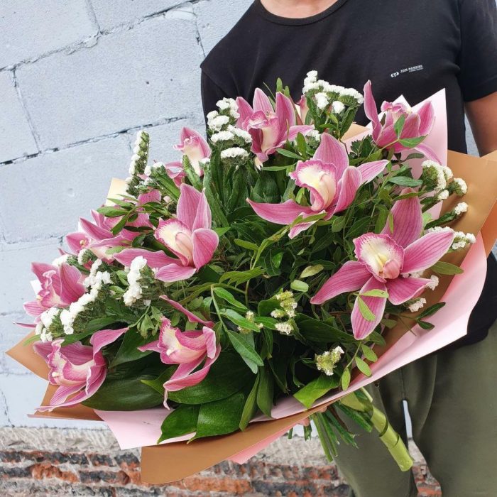 Орхидея Цимбидиум – 13 шт.Статица – 4 шт.Фисташка – 15 шт.Упаковка дизайнерская – 1 шт.