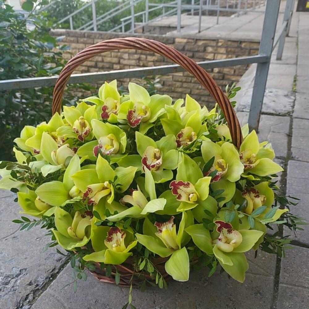Орхидея Цимбидиум ветка – 3 шт.Корзина плетеная – 1 шт.Фисташка пучок – 1 шт.Оазис флористический – 2 шт.
