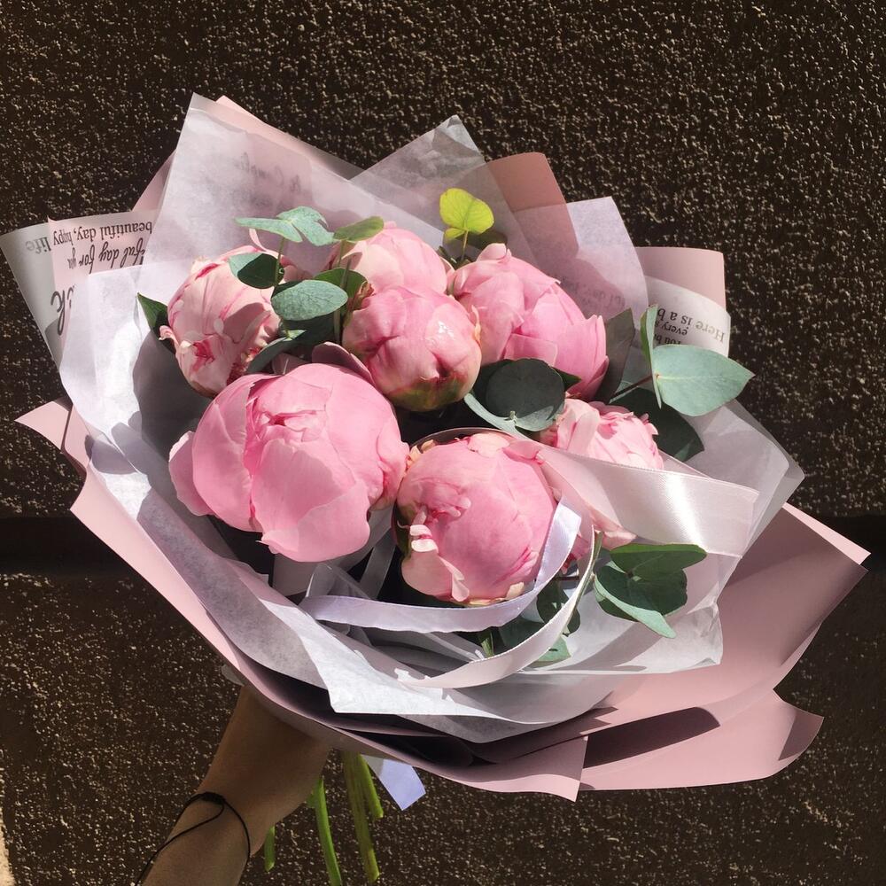 Пион Сара Бернар – 7 шт.Эвкалипт – 2 шт.Упаковка матовая пленка – 1 шт.Атласная лента – 1 шт.