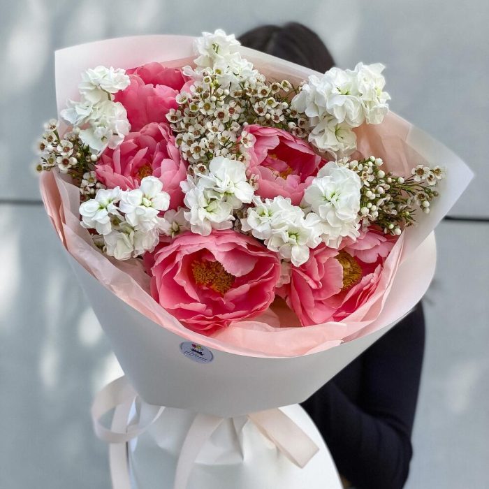 пионы – 5 шт. Маттиола – 7 шт. Ваксфлауэр – 3 шт.