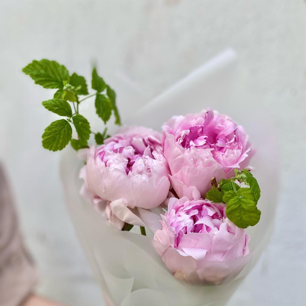 Пион Сара Бернар – 3 шт.Упаковка дизайнерская – 1 шт.ветка малины – 1 шт.