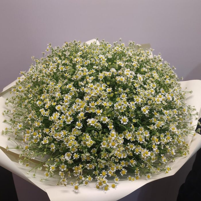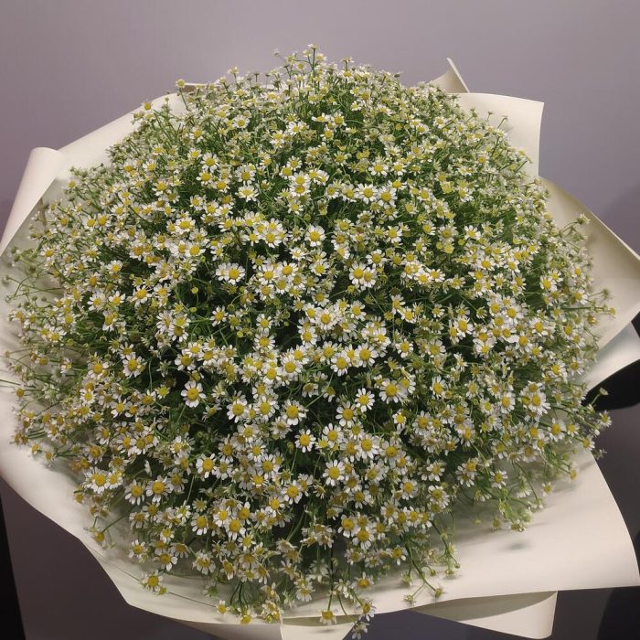 Матрикария (Ромашка Камила) – 101 шт.Упаковка дизайнерская – 1 шт.Лента атласная – 1 шт.