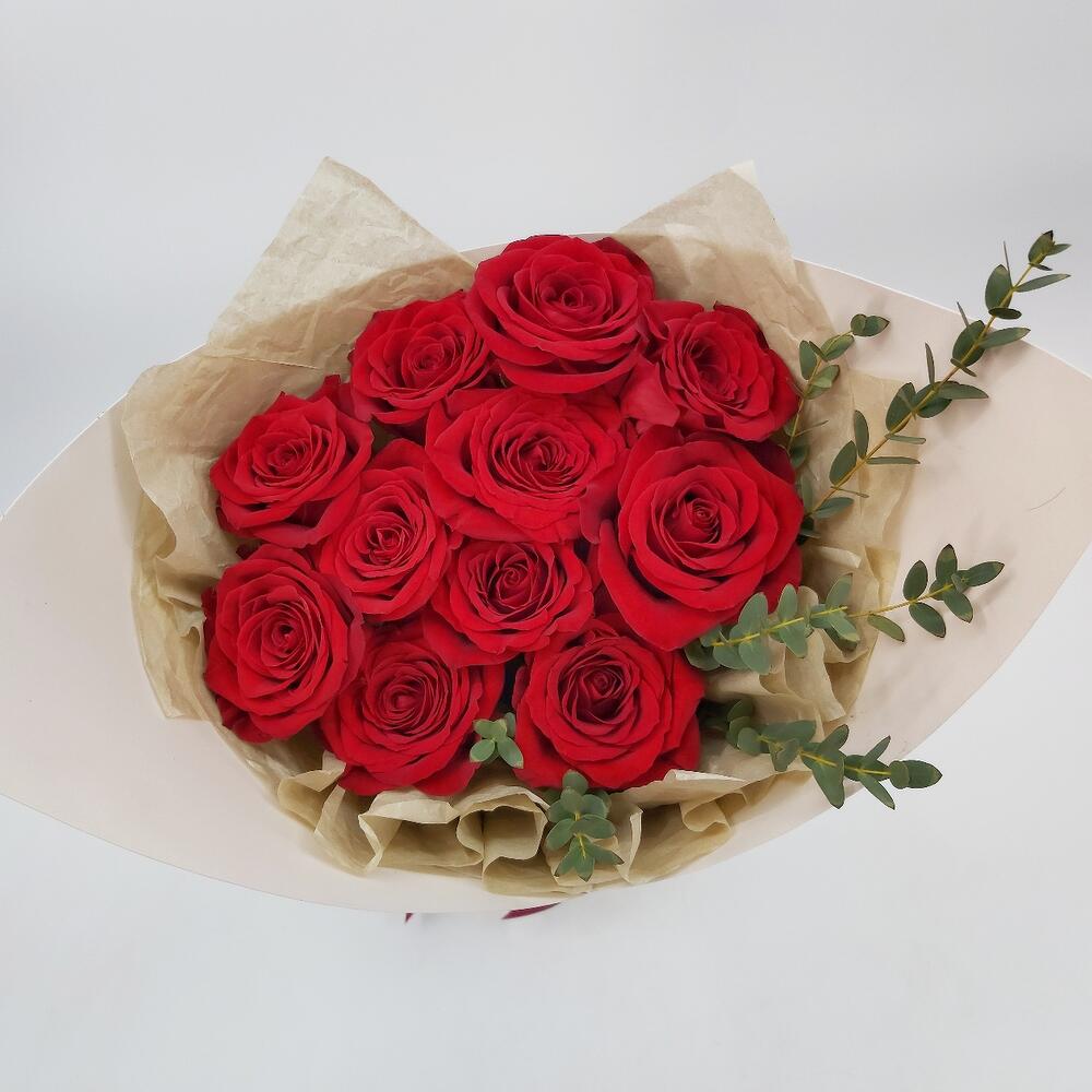 Эвкалипт – 1 шт.Роза Эквадор – 11 шт.Лента атласная – 1 шт.Упаковка тишью – 4 шт.Упаковка фоамиран – 2 шт.любовь флориста (бесплатно) – 1 шт.