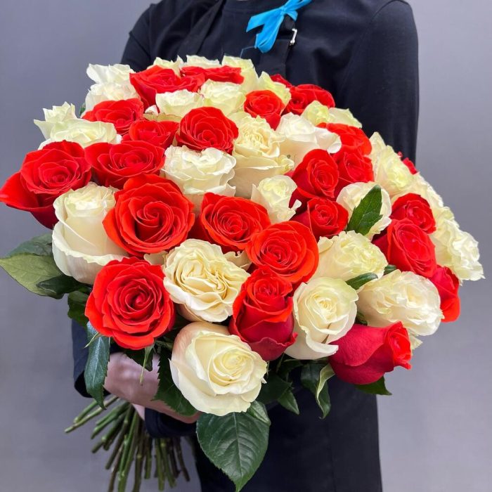 Роза Эквадор – 51 шт.Пленка прозрачная – 1 шт.Лента атласная – 1 шт.