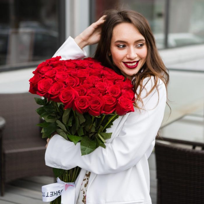 Роза красная – 51 шт.Лента атласная – 1 шт.Пленка прозрачная – 1 шт.