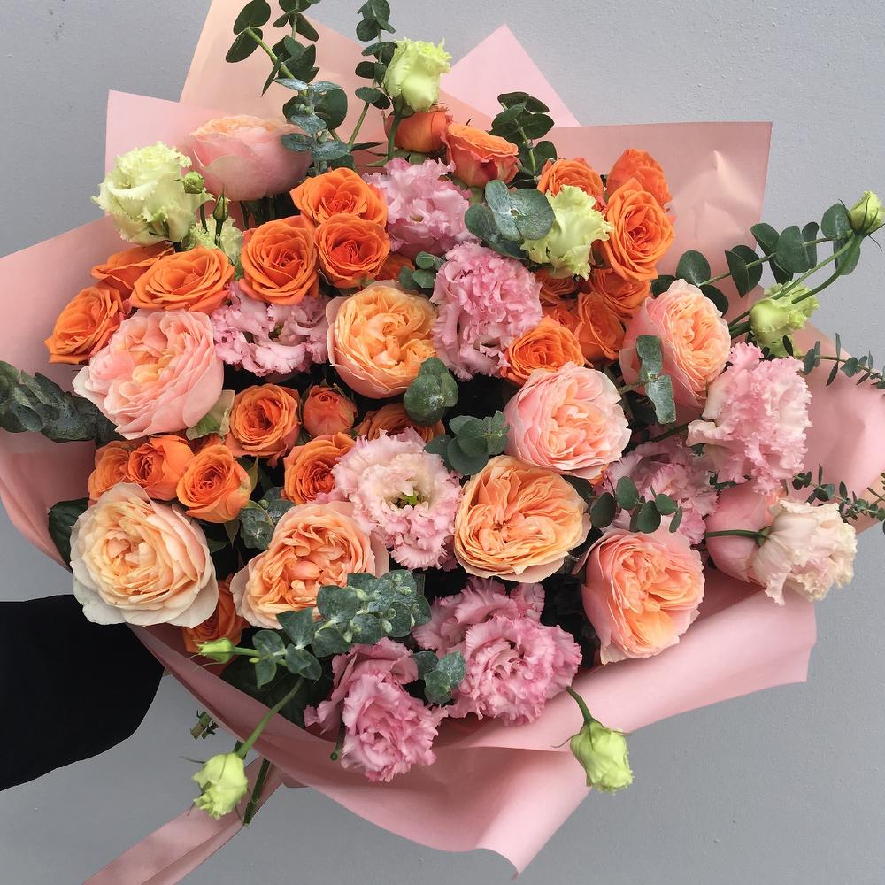 Роза пионовидная – 9 шт.Роза кустовая – 5 шт.Лизиантус – 9 шт.Эвкалипт – 9 шт.Упаковка – 3 шт.Лента атласная – 2 шт.