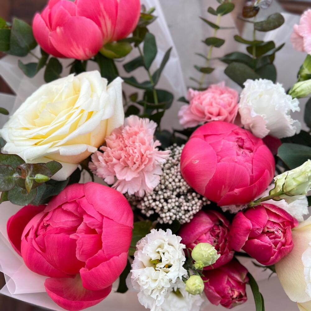 Озотамнус – 1 шт.Эвкалипт – 4 шт.Лента атласная – 2 шт.Диантус – 3 шт.Тюльпан пионовидный – 3 шт.Пленка матовая – 7 шт.эустома махровая белая – 1 шт.Пион коралл шарм – 3 шт.роза кэндллайт – 3 шт.