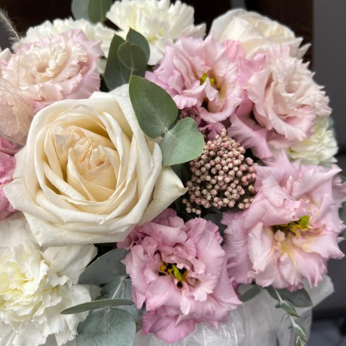 роза пионовидная вайт o’hara – 3 шт.эустома махровая розовая – 2 шт.Диантус – 4 шт.Ковыль – 1 шт.Озотамнус – 1 шт.Эвкалипт – 1 шт.Коробка шляпная – 1 шт.Оазис флористический – 1 шт.Тишью – 1 шт.Лента атласная – 2 шт.
