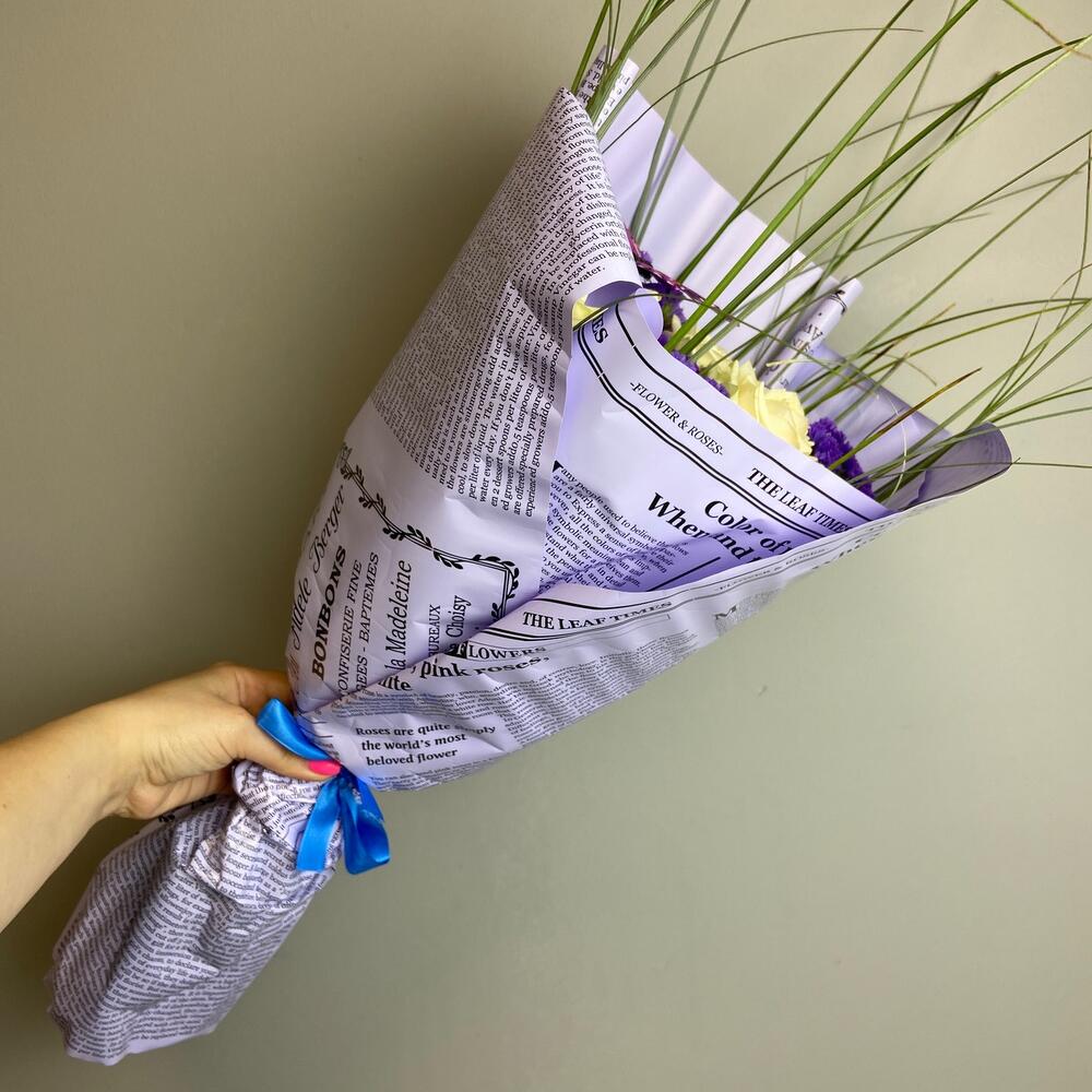 Роза одноголовая – 5 шт.Статица – 5 шт.зелень пучок – 1 шт.Декор бабочка – 1 шт.Упаковка дизайнерская – 1 шт.