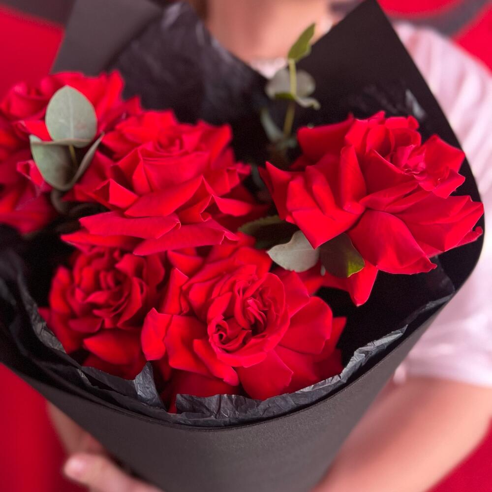 Эвкалипт – 1 шт.Лента атласная – 1 шт.Тишью – 1 шт.фоамиран черный – 1 шт.роза красная французская – 5 шт.