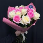Розовая роза – 7 шт.белая роза – 8 шт.Упаковка цветная – 2 шт.Лента атласная – 4 шт.