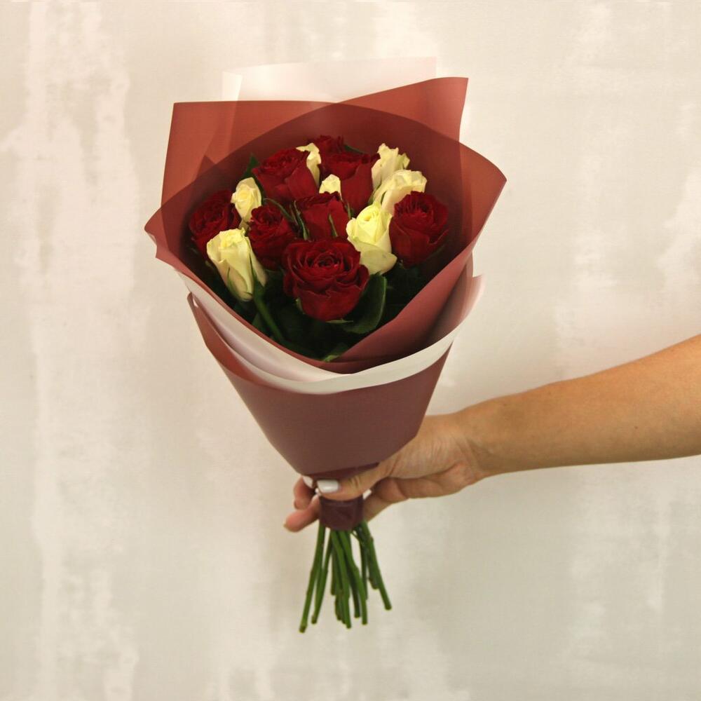 Букет из 15 красной и белой розы микс 35-40 см (Кения) в стильной упаковке