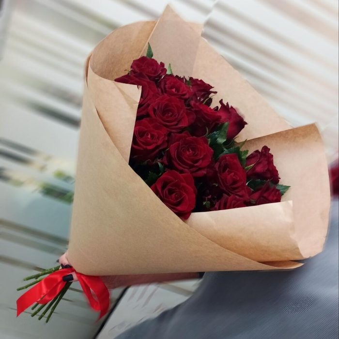 Лента атласная – 1 шт.Крафт – 3 шт.Роза россия красная 60 см – 15 шт.