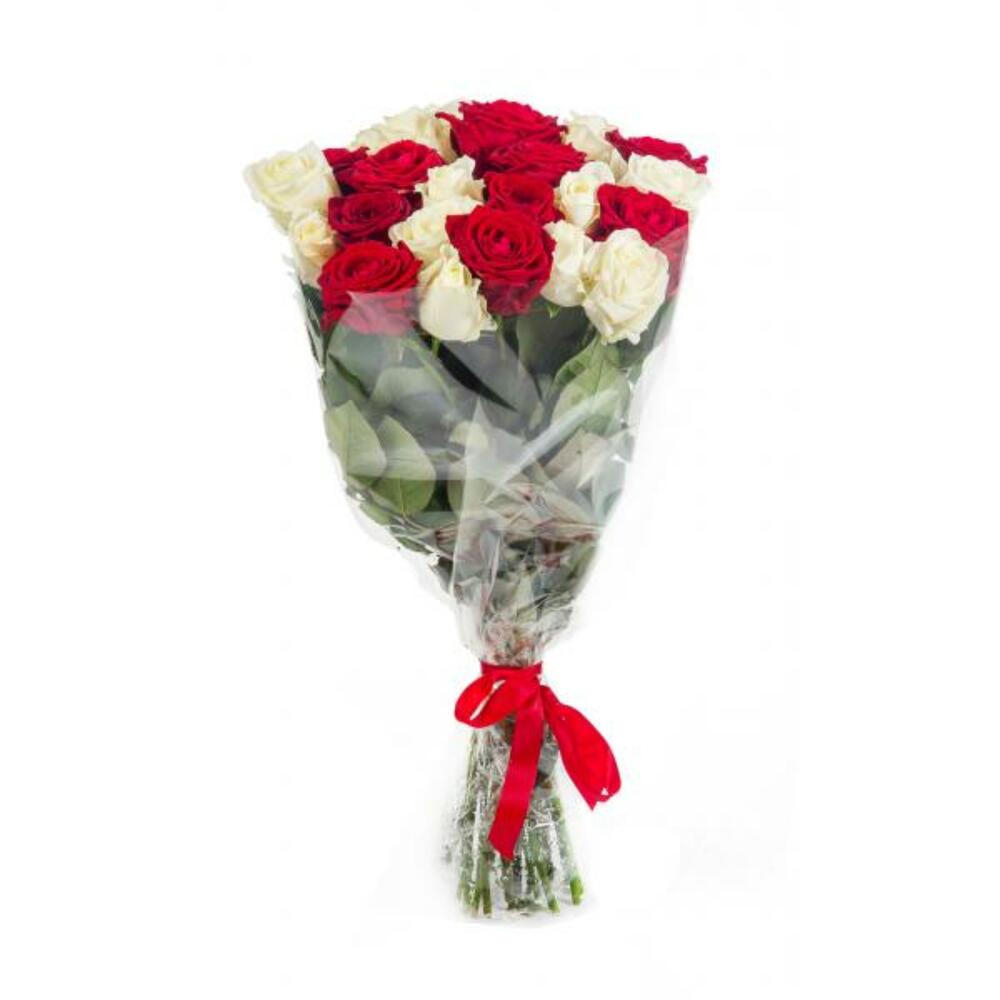 роза красного цвета 60 см – 7 шт.роза белая аваланш 60 см – 8 шт.Упаковка – 1 шт.