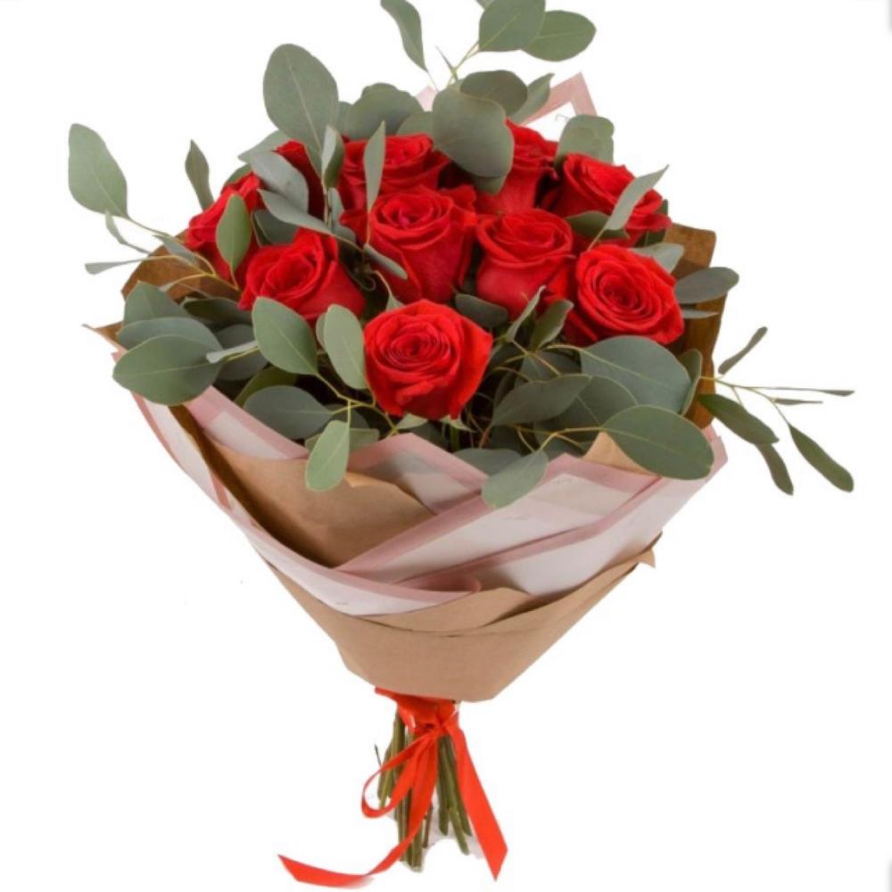 розы – 19 шт.Эвкалипт – 1 шт.крафт бумага и атласная лента – 1 шт.