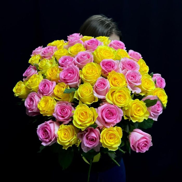 Розовая роза – 24 шт.Лента атласная – 1 шт.Желтая роза – 27 шт.