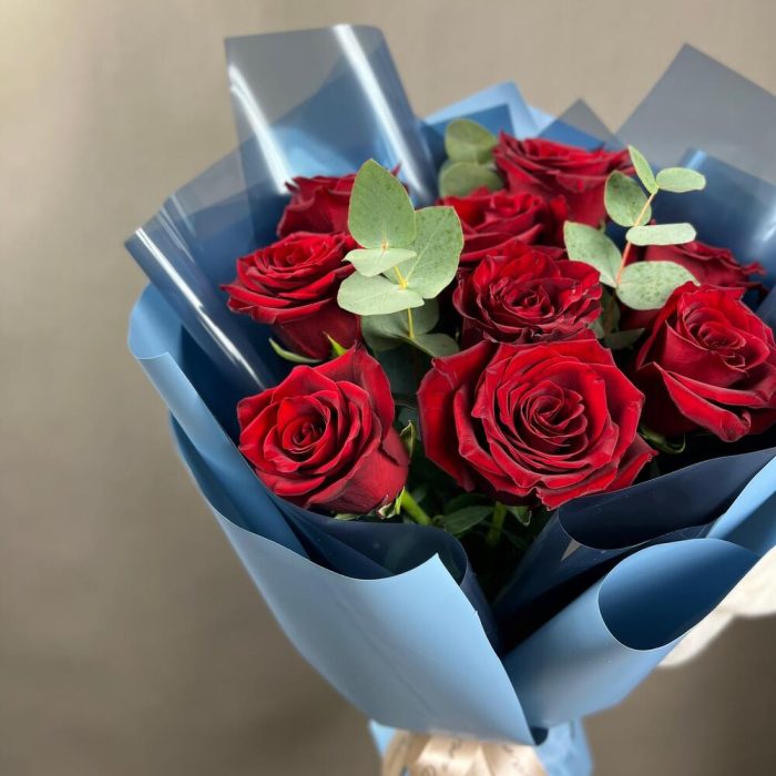 Эвкалипт – 3 шт.Лента атласная – 2 шт.Пленка матовая – 5 шт.Роза эксплорер 50 см – 9 шт.пленка полупрозрачная – 4 шт.