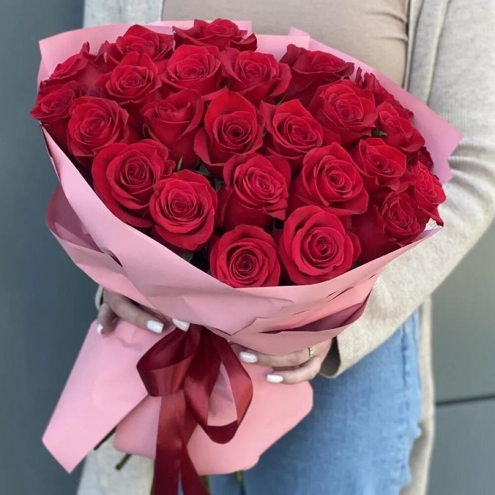 розы красные – 25 шт.Упаковка дизайнерская – 3 шт.Лента атласная – 1 шт.работа флориста – 1 шт.