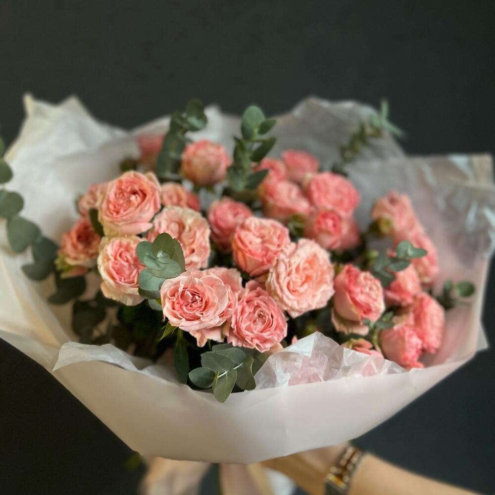Кустовая пионовидная роза – 7 шт.Эвкалипт – 9 шт.декоративная упаковка – 1 шт.Атласная лента – 1 шт.