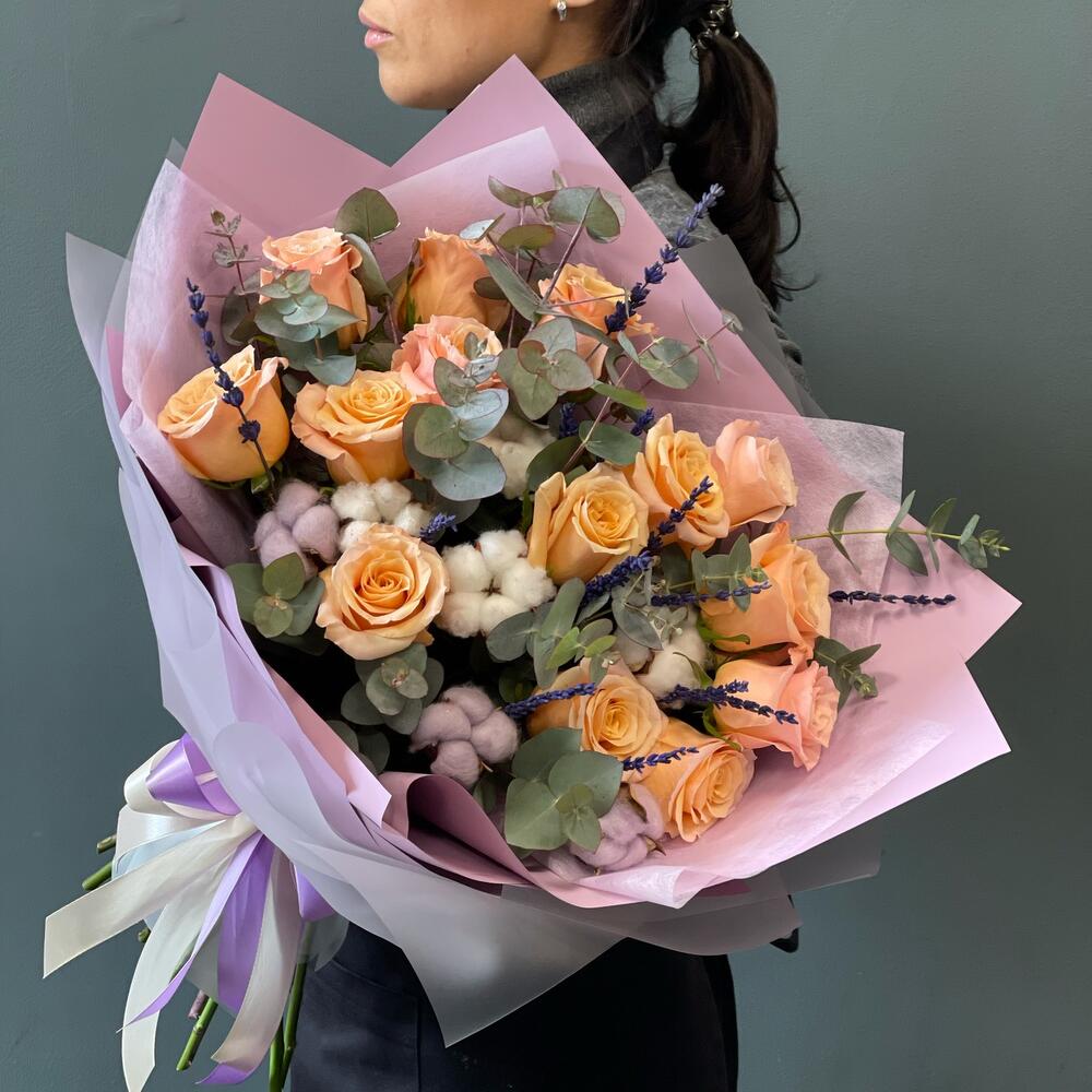 Лаванда (сухоцвет) – 15 шт.Лента – 2 шт.Хлопок – 7 шт.Эвкалипт – 4 шт.Роза одноголовая – 15 шт.Упаковка дизайнерская – 2 шт.Кризал (подкормка) – 1 шт.