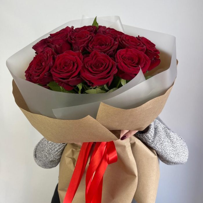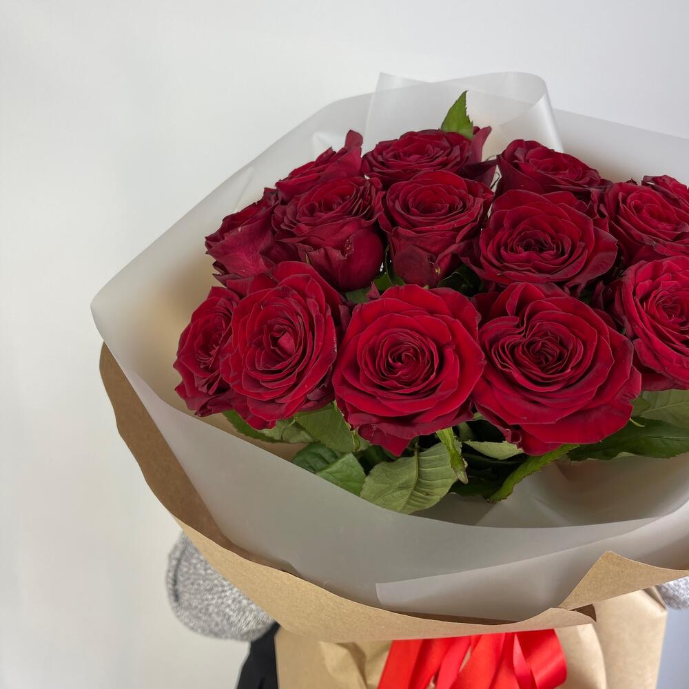 Роза – 15 шт.Лента атласная – 2 шт.Крафт – 2 шт.Пленка матовая – 2 шт.