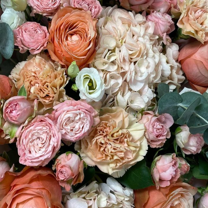 Гортензия – 2 шт.Эвкалипт – 3 шт.Эустома – 3 шт.Диантус – 5 шт.Роза пионовидная – 5 шт.Кустовая пионовидная роза – 7 шт.Упаковка дизайнерская – 4 шт.зелень декоративная – 3 шт.