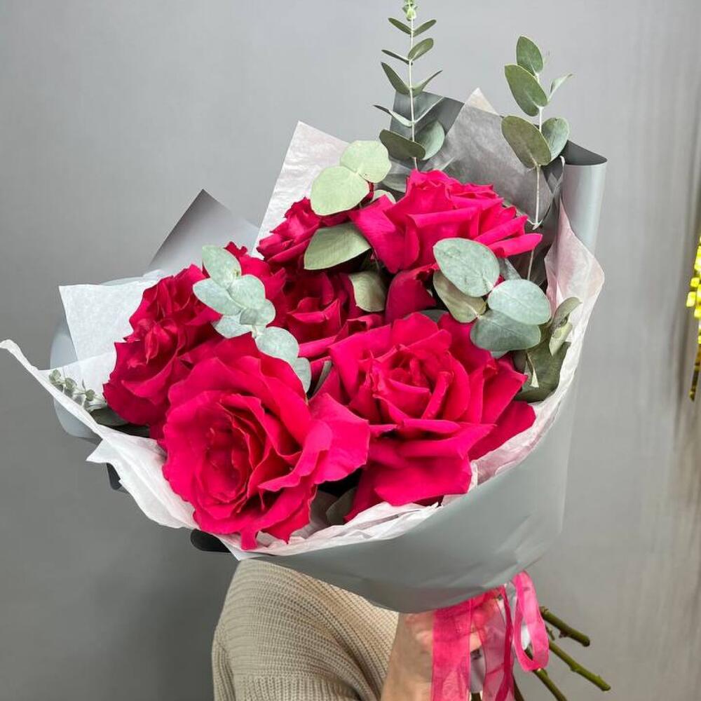 Букет с малиновыми розами и эвкалиптом