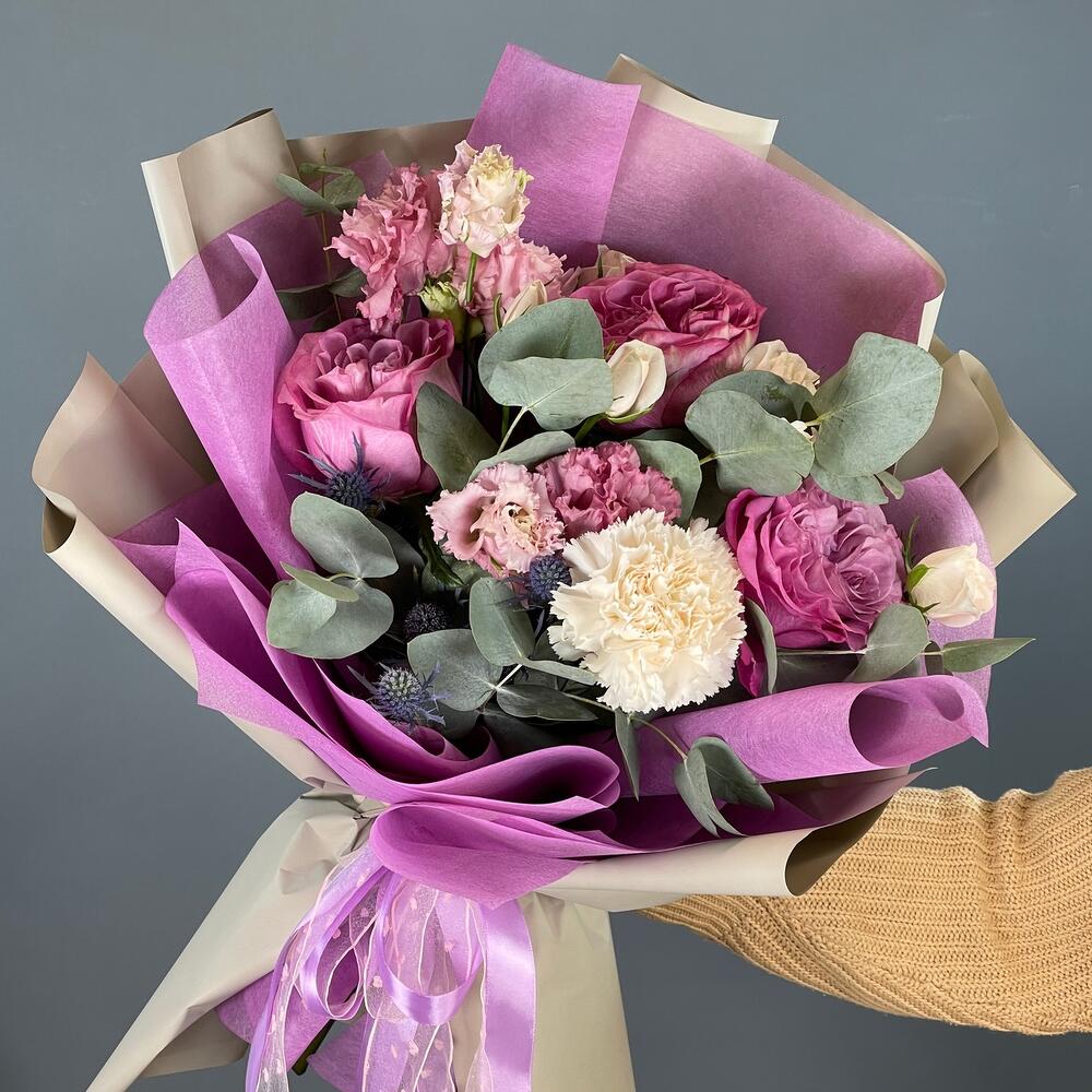 Лента – 2 шт.Лизиантус – 1 шт.Роза кустовая – 2 шт.Эвкалипт – 2 шт.Эрингиум – 1 шт.Роза одноголовая – 3 шт.Упаковка дизайнерская – 2 шт.Гвоздика одноголовая – 1 шт.