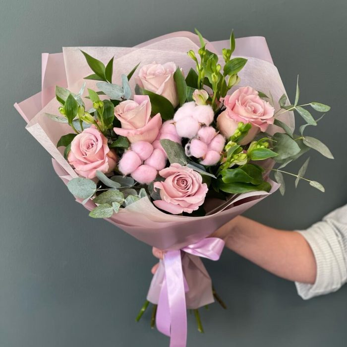 Альстромерия – 3 шт.Лента – 1 шт.Рускус – 5 шт.Хлопок – 4 шт.Эвкалипт – 2 шт.Роза одноголовая – 5 шт.бумага упаковочная – 1 шт.