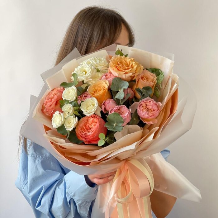 Лента – 1 шт.Роза кустовая – 2 шт.Эвкалипт – 1 шт.Роза одноголовая – 5 шт.Упаковка – 2 шт.Роза Джульетта – 1 шт.