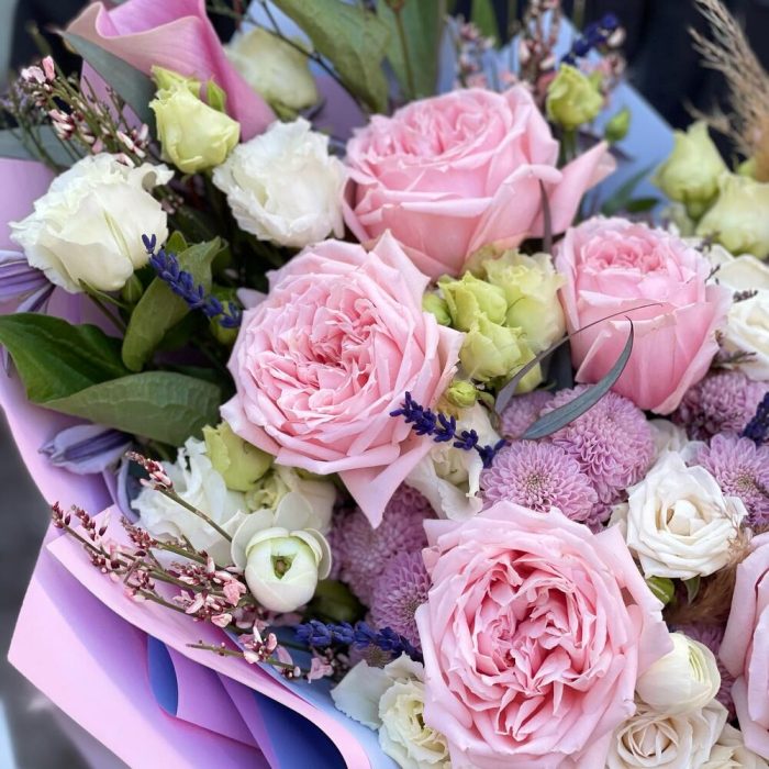 роза пионовидная «принцесса хитоми» – 7 шт.Роза кустовая – 5 шт.Эрингиум – 2 шт.Лимониум – 3 шт.эустома махровая – 5 шт.Клематис – 2 шт.Калла – 3 шт.Ваксфлауэр – 3 шт.картадерия (сухоцвет) – 1 шт.эвкалипт робуста (пучок) – 1 шт.Эвкалипт цинерея – 2 шт.писташ пучок – 1 шт.Подарочная упаковка – 1 шт.Лента атласная – 2 шт.