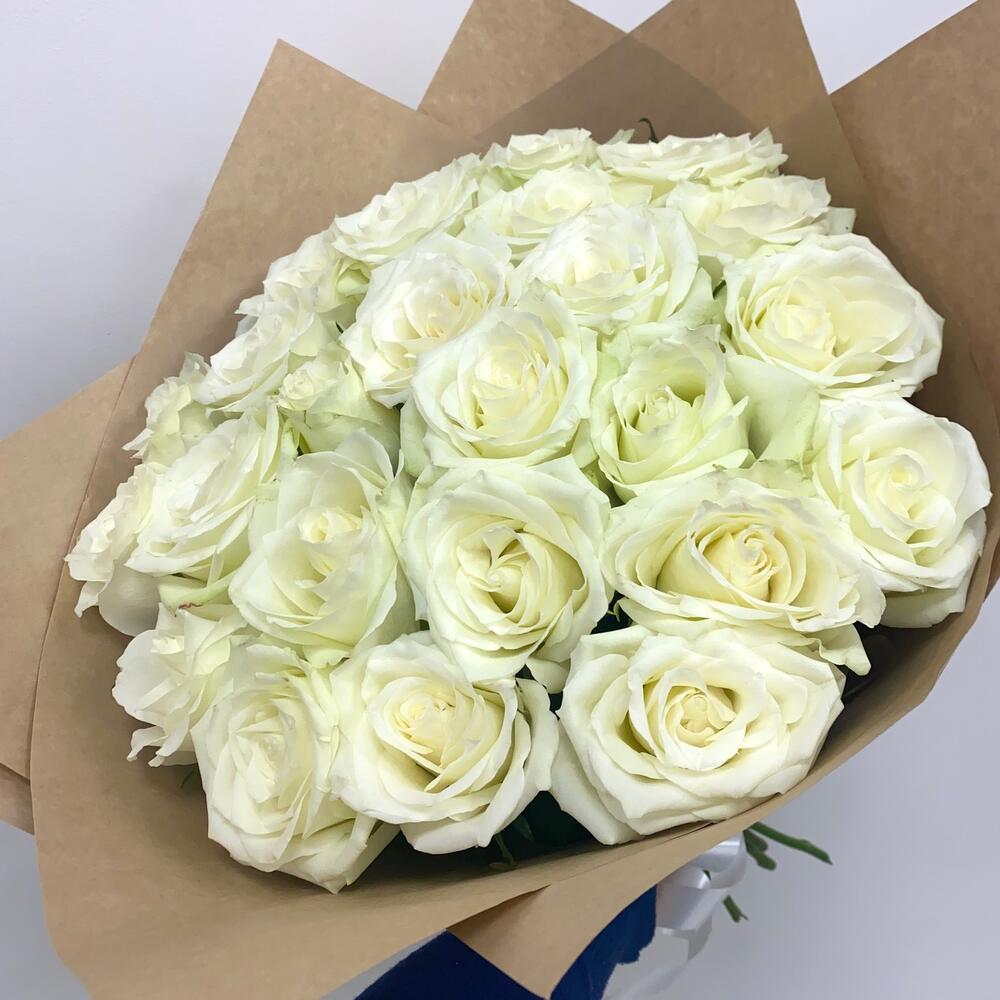 Роза белая – 25 шт.Упаковка крафт – 1 шт.Лента – 1 шт.