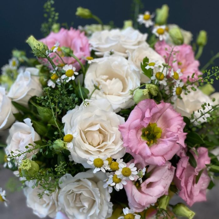 Цветочная композиция в шляпной коробке с розой, лизиантусом и матрикарией.Композиция, которая подарит искренние эмоции каждому.* По вашей просьбе, мы подпишем открытку с наилучшими пожеланиями.* Каждый букет цветов (композиция цветов в коробке) упаковывается в прозрачную плёнку и в крафтовый пакет.* К букету прилагается инструкция по уходу и пакетик с подкормкой для продления жизни срезанных цветов в вазе и цветочных композициях на флористической губке.