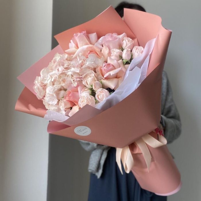 Альстромерии, Гортензии, Кустовые розы, Лизиантусы, Розы, Хризантемы
