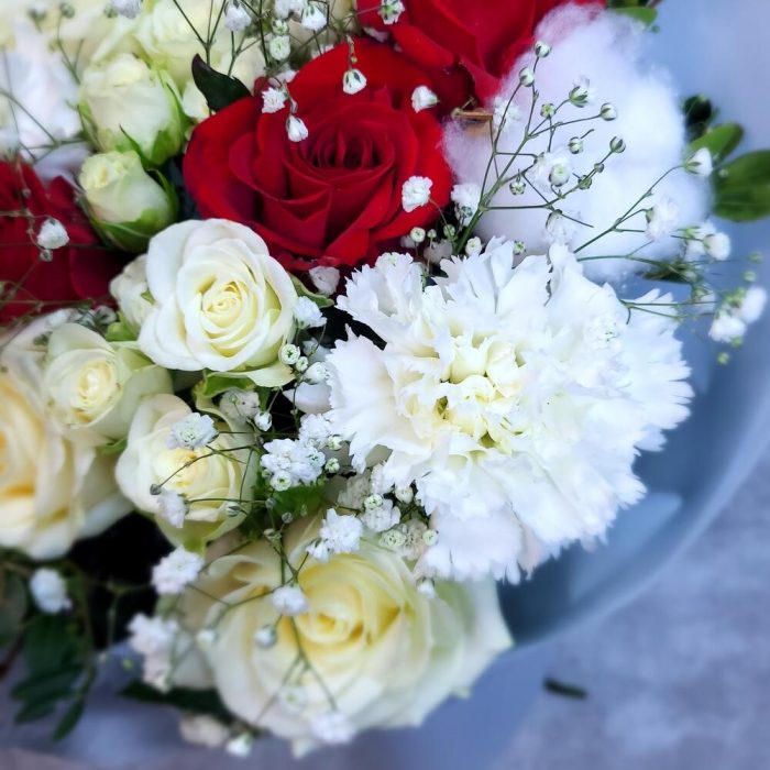 Роза – 7 шт.Гвоздика – 2 шт.Хлопок – 1 шт.Гипсофила – 1 шт.Роза кустовая – 2 шт.Упаковка дизайнерская – 1 шт.