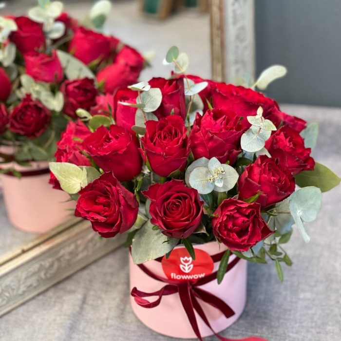 Композиция в шляпной коробке из 19 роз “Алые розы”