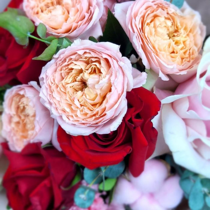 Хлопок – 1 шт.Эвкалипт – 1 шт.Роза Эквадор – 2 шт.Гвоздика – 2 шт.Роза кустовая пионовидная – 1 шт.