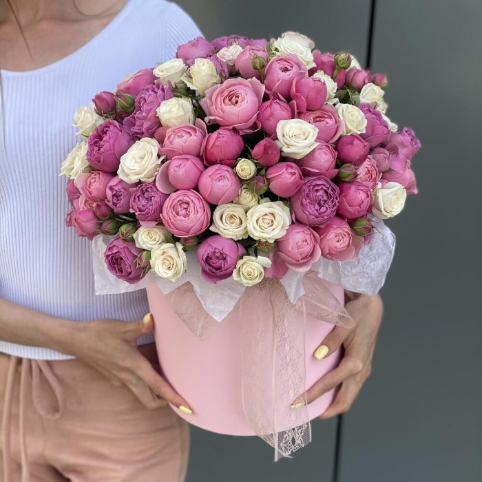 Оазис – 2 шт. Коробка – 1 шт. Кустовая пионовидная роза – 21 шт.