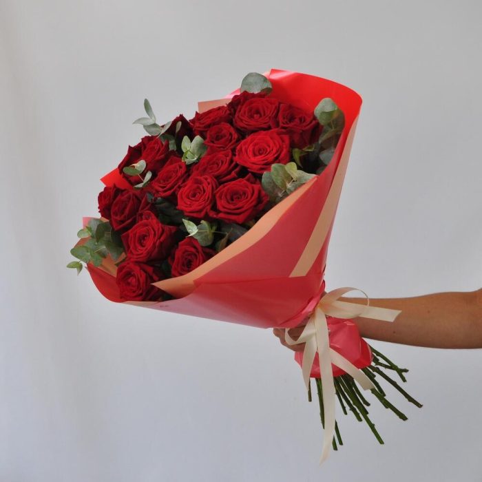 Эвкалипт – 5 шт.Лента атласная – 1 шт.Упаковка дизайнерская – 2 шт.Роза Россия 60 см – 19 шт.