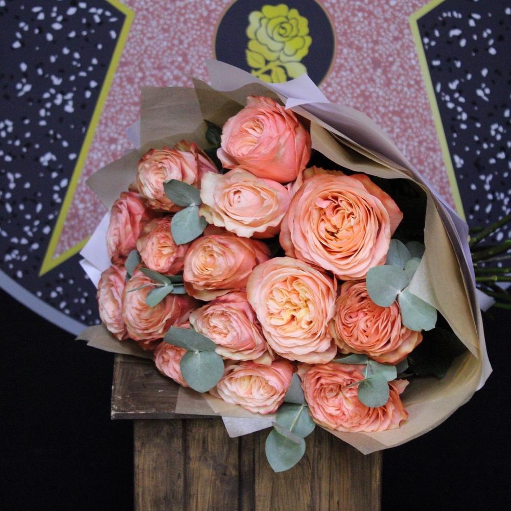 Роза пионовидная – 15 шт.Эвкалипт – 3 шт.Пленка дизайнерская – 3 шт.